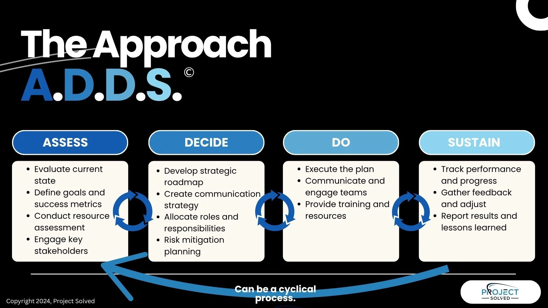 Every Project Solved engagement is guided by our proprietary A.D.D.S. framework — a four-phase implementation methodology designed to create lasting, sustainable change. Assess. Decide. Do. Sustain. We don't just hand you a plan. We stay with you through all four phases until the work is done.